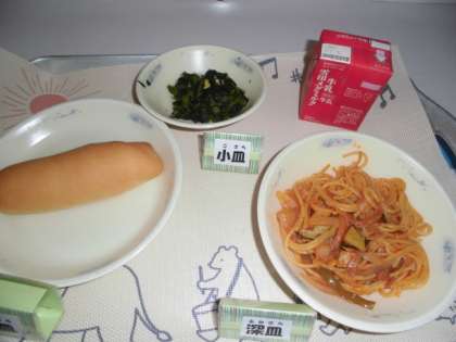 今日の給食は『小型コッペパン』『牛乳』『イタリアンスパゲティ』『ほうれん草のソテー』というメニューでした。スパゲティは,ケチャップの甘酸っぱい味わいが子どもたちにも人気です。