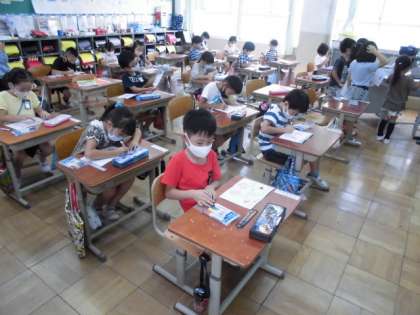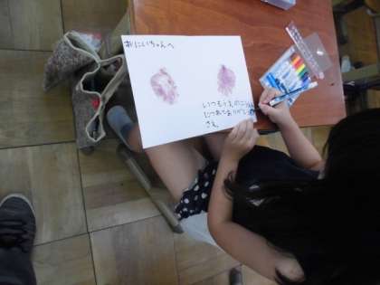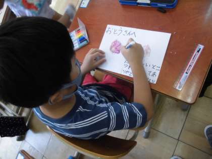 1年生の子どもたちは,アサガオの花で作った色水で模様を描き,その傍らには,日頃お世話になっている家族に『ありがとう』の気持ちを込めた『おてがみ』をそえています。