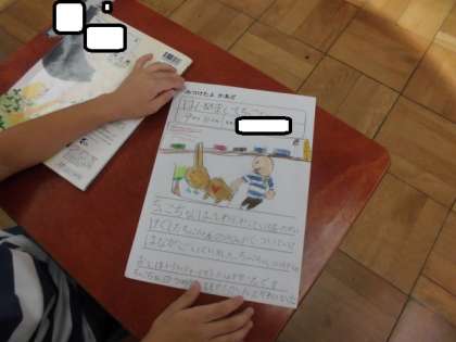 今日は,学校で飼育しているウサギの『ちょこちゃん』と仲良しになりました。ちょこちゃんを抱っこしたり,さわったりした後に感想を絵や文で表しました。