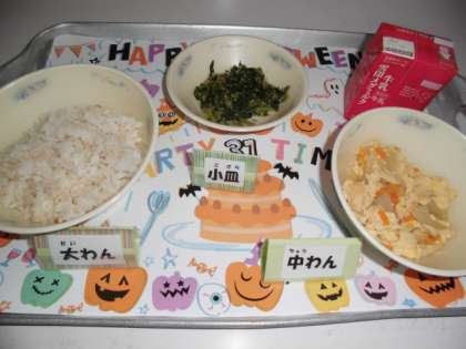 今日の給食は『麦ごはん』『牛乳』『あげたま煮』『だいこん葉のごまいため』というメニューでした。