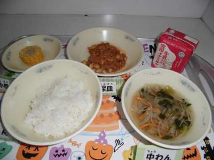 今日の給食は,『ごはん』『牛乳』『大豆とツナのドライカレー』『カットコーン』『スープ』というメニューでした。