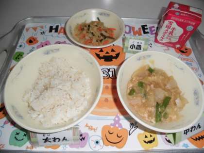 今日の給食は『麦ごはん』『牛乳』『じゃがいものそぼろ煮』『ごま酢煮』というメニューでした。