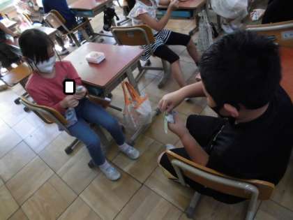 子どもたちは,自分の計算カードの答えを相手に知らせ合って,ゲームを楽しんでいます。しっかりと距離も保ってゲームができていました。