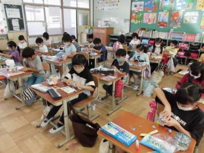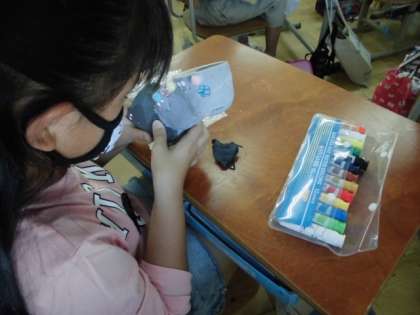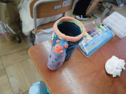 今日は,お家でご準備くださった空き容器から創造を膨らませて作品づくりをしました。仕上げには,紙粘土に色を練りこんだり,筆で色をつけたりしながら,飾りつけをしました。素敵な作品が勢ぞろいしましたので,参観日にご覧ください。