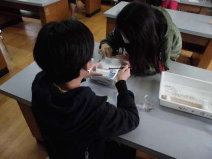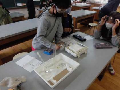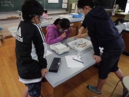 5年生は理科室で実験中です。