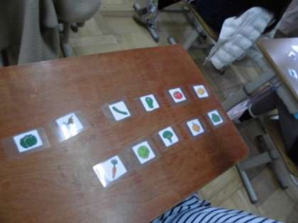 今日は,野菜の絵が載っているカードを使って,いろいろな野菜の名前を聞いたり,話したりしています。