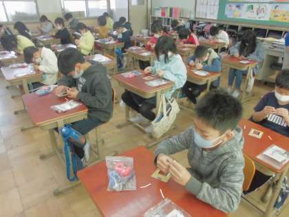 子どもたちは,興味や関心をもちながらモノづくり活動に取り組んでいました。指で,出来上がったパネルに触れると明かりが点く仕組みです。