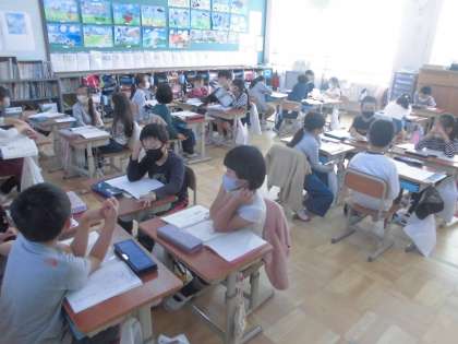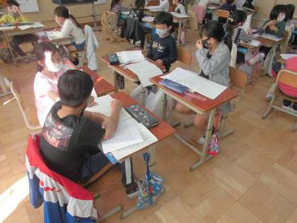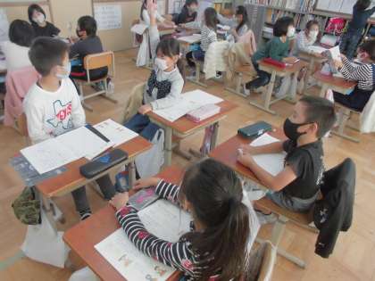 2年生は国語科の授業で,『グループで話し合おう』という学習に取り組んでいます。初めに話し合う話題(相談)を確かめ,次に話題について考えたことと,その理由を伝えあいます。友だちと同じ考えであったり,いい考えだと気づいたりしたら,友だちのその考えを繰り返して発言します。また,もう一度聞いたり,質問をしたりして考えを交流します。