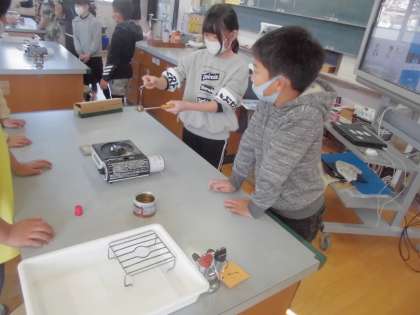 子どもたちは,初めて実験用のカセットコンロを扱うので,ボンベのセットや着火の練習などを全員が試してから実験に入りました。
