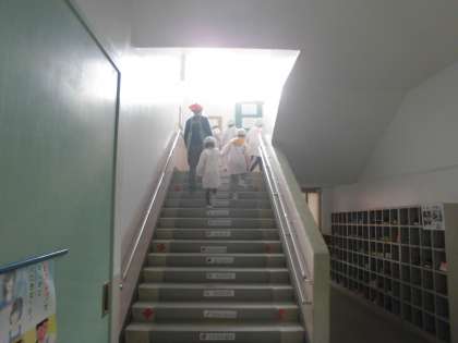 2年生の子どもたちも,重たい食器や食缶を持ちながら,給食当番の仕事を頑張っています。