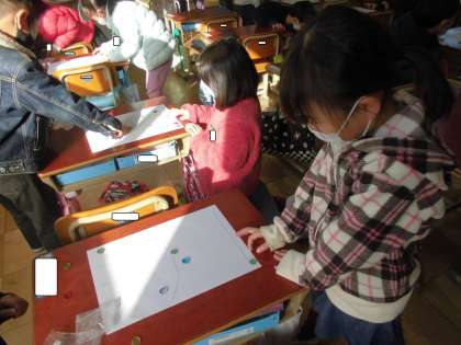 今日は,おはじきを使った『点とりゲーム』をしながら『0』の学習をしました。おはじきを指ではじき,決められた枠に入ると点数が加算されます。でも,おはじきが枠から外れてしまうと点数は加算されません。