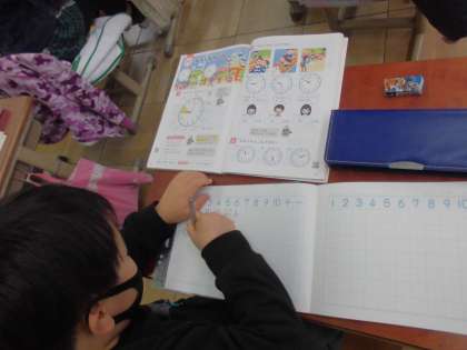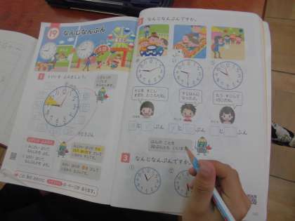 1年生の子どもたちにとって,『とけい』の学習は,大変難しい課題です。時計の模型や時計の絵を見て,何時何分や何時半と読み取っています。少なくなってきたアナログの時計を生活の中で活用していると習得はスムーズです。