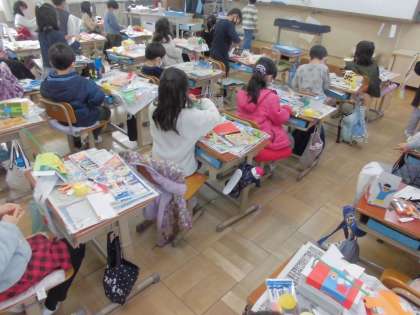 1年生の教室では,図画工作科の時間に息を吹き込むとニョキニョキと伸びて飛び出すおもちゃの工作中です。