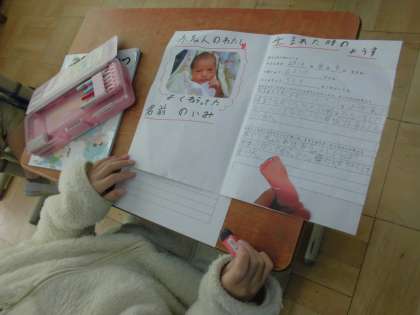 2年生は,生活科の学習で自分が赤ちゃんだった頃の話をお家の方から聞き取り,そのころの写真と様子をまとめたリーフレットを作りました。