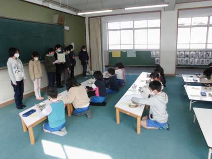 給食週間の取組の一つにある「豆つまみ大会」が中間休みに行われました。給食委員会の児童が準備や進行を行っています。今日は3年生の児童が参加です。制限時間内にできるだけたくさんの豆をつまもうとがんばっていました。