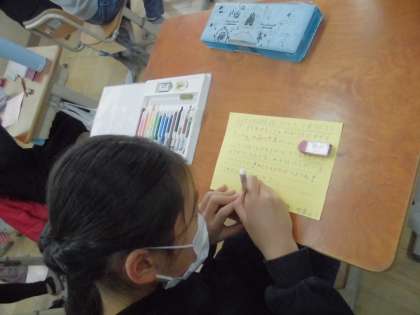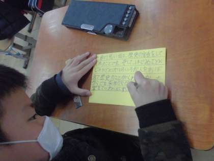 3年生は,この1年間を振り返って一番心に残っていることを書き留めています。子どもたちの感想の中には,担任の先生への思いがたくさん綴られていました。特に,歴史の話をしてもらうことが楽しかったようで,「歴史が分かって嬉しかった。」というものがありました。