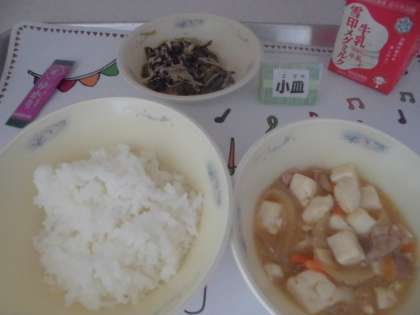 今日の給食は,『ごはん』『牛乳』『豚肉ととうふのくず煮』『ほうれん草ともやしのごま煮』『ふりかけ(しそ)』というメニューでした。