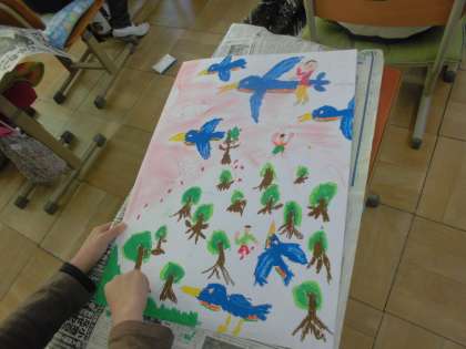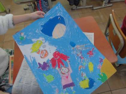 今日は,雲や虹,鳥や生き物など,何かに乗って行ってみたいなと想像した出来事を絵に表わしています。