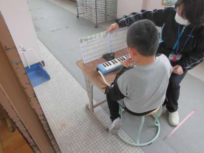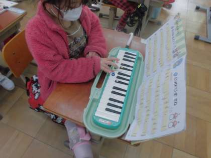 今日は,一人一人が順番に廊下で鍵盤ハーモニカを演奏して,教室では廊下から流れてくる音を聞きながら,指遣いだけの練習をしています。