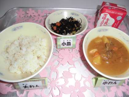 今日の給食は,『麦ごはん』『牛乳』『カレー』『ひじきのソテー』というメニューでした。手作りカレーは,本年度も大人気メニューです。1年生も,しっかりといただいています。