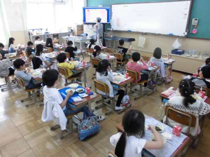 給食当番は,間隔を空けて並び手指の消毒をして役割を果たしています。今年度も給食の盛り付けは,手指を洗い消毒をした指導者(大人)が行います。