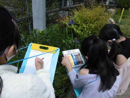 今日は『春』という季節を感じる自然の様子を調べています。校庭の木々や草花,虫などの様子と季節を関連付けています。この学習は,それぞれの季節の特徴をとらえるために1年間継続して観察をします。