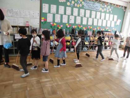 5時間授業が始まり、いよいよ今日は「そうじデビュー」となりました。「幼稚園でもやってた〜。」「早くそうじしたい〜!」と嬉しい言葉が聞こえてきましたよ。ほうき・机運び・ぞうきんと、分担してきれいにそうじをします。「自分たちの教室を、自分たちできれいにする。」とっても大事なことですね。