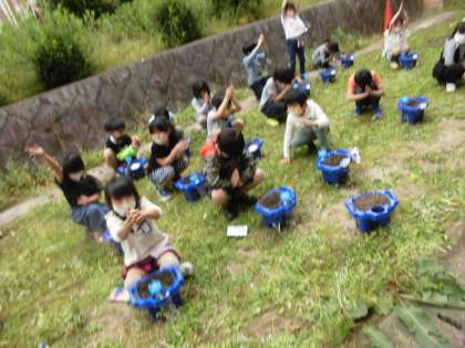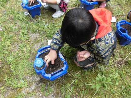 生活科の学習で朝顔のたねをまきました。栄養満点のふかふかの土に、やさしくそうっとたねをまきました。とても小さな種を大事そうに持って、土の中にうめました。最後に、「元気な芽が出ますように!!」とおまじない。早く芽が出てほしいね。何色の花が咲くかな!?