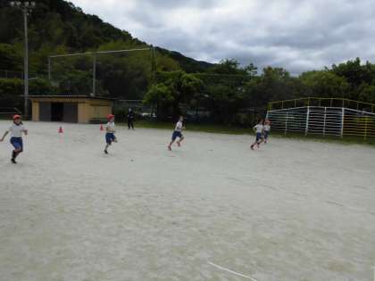 通常は体育館を利用して行っていたのですが,感染予防の観点から運動場で人と人との距離をとりながら取り組んでいます。