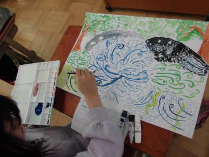 子どもたちは,『まぼろしの花』という題名や言葉の響きから想像を広げて,『不思議な花』や『闇に咲く花』『カラフルな花』と連想し,作品の完成を目指しています。