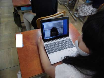 今日は,カメラ機能で自分の写真を撮って名刺を作り,それを先生の端末に送信しました。みんな上手に操作しています。