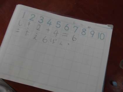いよいよたしざんの学習が始まりました!「やったー!」「たしざん、簡単!」と嬉しそうな1年生。でも、いざ学習が始まると…。「問題文を読んで、問題場面をイメージして、数図ブロックを動かして考え、ノートに式と答えをかく。」という一連の流れで毎時間学習を進めていくので、なかなか大変です。算数は、数字だけ見て単に計算するのではなく、問題場面をイメージして考えることがとても大事なのです。このことを、1年生からしっかり取り組んでいきたいです。