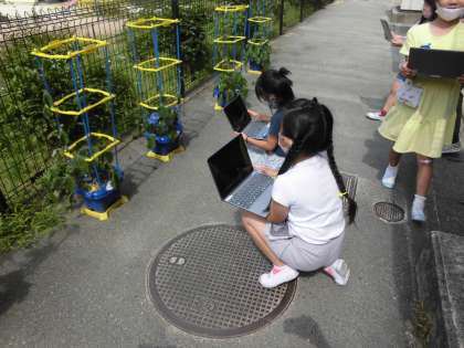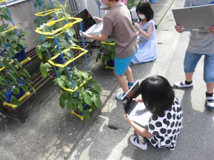 GIGA端末の使い方練習を4回ほどやった1年生。さっとログインできる人がずいぶん増えました。今日はいよいよ次のステップ。GIGA端末で自分のあさがおの写真を撮りました。目で見て観察記録を書くのも楽しいですが,端末で写真を撮るのも楽しい1年生でした。今日も,「先生,見て〜!」の声が飛び交いました。