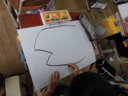 今日は,大きな魚の形をパスで描き,その魚のウロコを絵具で色付けしながら使い方を学ぶようです。どんな色の魚が誕生するのか楽しみです。