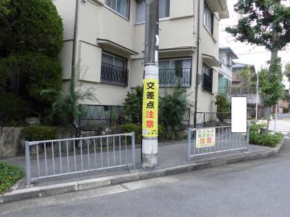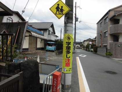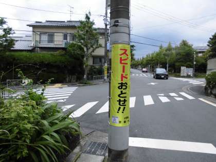 学校付近で一番見通しの悪い交差点に掲示していた電柱幕を新調しました。人も車も十分注意して通行する必要があります。