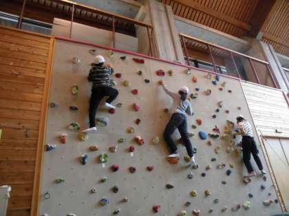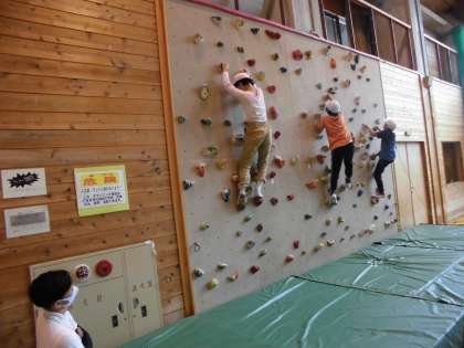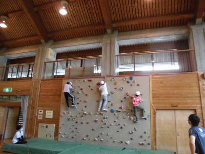 雨が降り始めたので,野外での活動を中止してボルダリングに挑戦しました。みんな目標をクリアして楽しく活動しています。