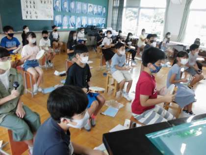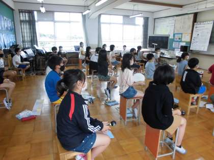 前回もお知らせしましたが,緊急事態宣言中のために活動内容に制限があります。そのような中ですが,今日は打楽器を使って重なり合うリズム打ちに挑戦しています。