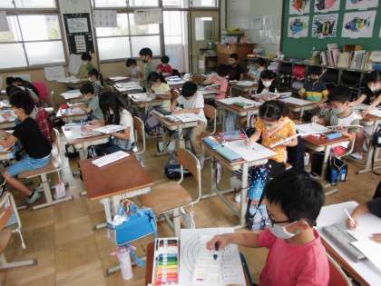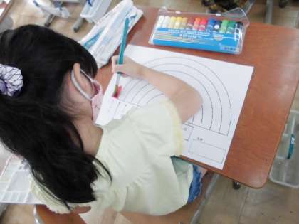 でもその前に,1学期に学習した絵具の使い方を思い出します。子どもたちは,水の量や絵具の混ぜ方に注意しながら,まず,虹に色づけをしています。