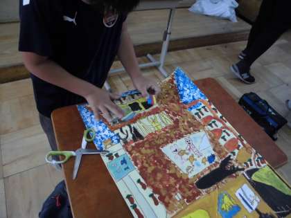 子どもたちは,最後の仕上げにコンテをハサミで削って着色したり,指で絵具を塗ったりと工夫しながら活動を楽しんでいます。