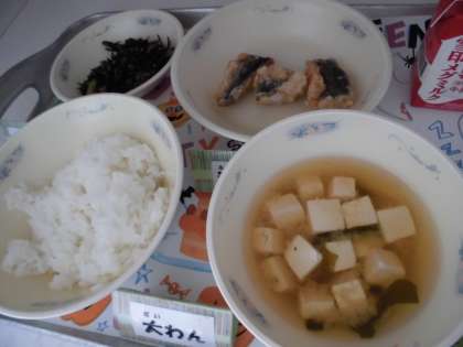 今日の給食は,『ごはん』『牛乳』『とびうおのこはくあげ』『小松菜とひじきのいためもの』『みそ汁』というメニューでした。