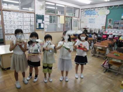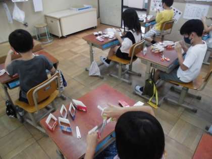 固い牛乳パックを切ったり,輪ゴムを差し込む小さな切れ目を入れたり,外れないように部品をつなぎ合わせたり…と,思っていた以上に難しかったみたいですが,最後には楽しいびっくり箱が出来上がりました。「お家でも作ってみたい!」という人もいたので,今週金曜日に配るお便りの裏面に,作り方を紹介しておきますね。