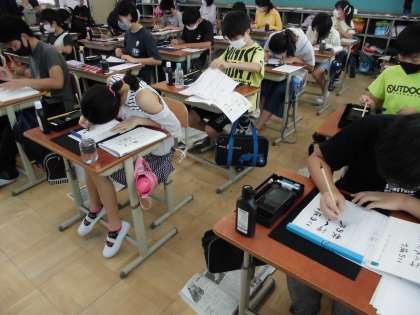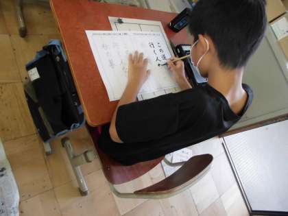 今日は細筆を使って小さな文字を書く練習です。子どもたちは,気持ちを集中させながら筆を走らせています。