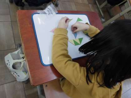 今日は三角形の色板を並べて,様々な形づくりに取り組んでいます。