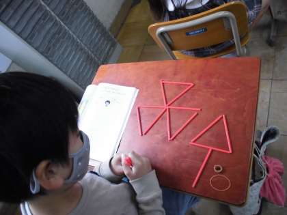 今日は『ひご』を使って『かたち づくり』をしています。提示されたモデルと同じ形を作ろうと頑張っています。