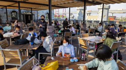 おうちで作っていただいたお弁当を食べ,プログラミングのワークショップに参加しました。これから班行動で園内を回ります。