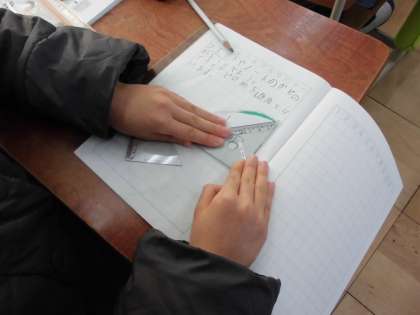今日は『直角』という『かたち』を知るために,折り紙で直角の『かたち』をつくり,三角定規でその『かたち』が直角であることを確かめています。