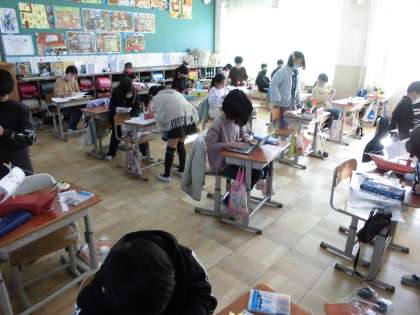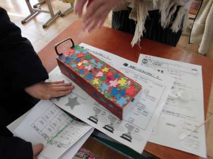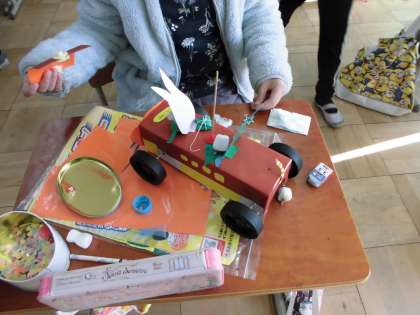 今日は,その車に飾りつけをしています。それぞれの発想で楽しい車が出来上がっていきます。早くできた人は,友だちのお手伝いもしています。