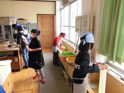 具材となる油揚げや野菜を慎重な面もちで切りそろえています。子どもたちは,段取りよく洗いものなども同時進行で済ませていました。
