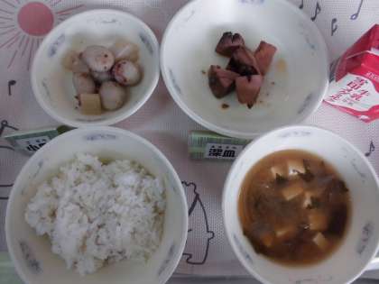 今日の給食は『麦ごはん』『牛乳』『なま節のしょうが煮』『里いもとこんにゃくの土佐煮』『みそ汁』という地産地消(京北みそ)献立でした。
