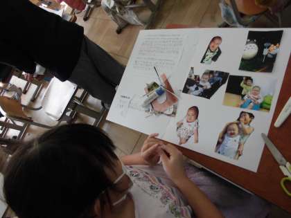 お家で準備してくださった写真や思い出の品物を見ながら,自らの成長を感じているようです。